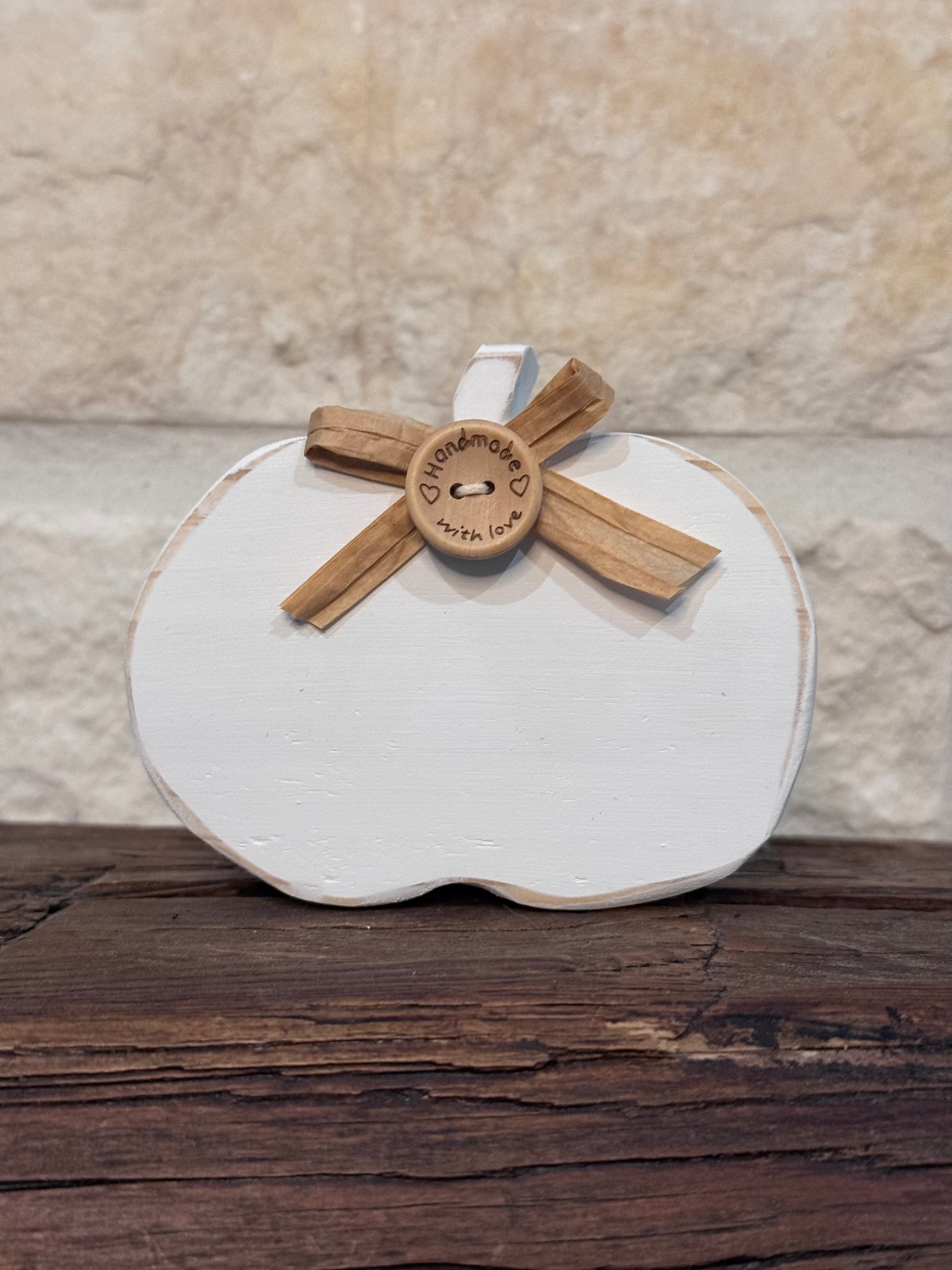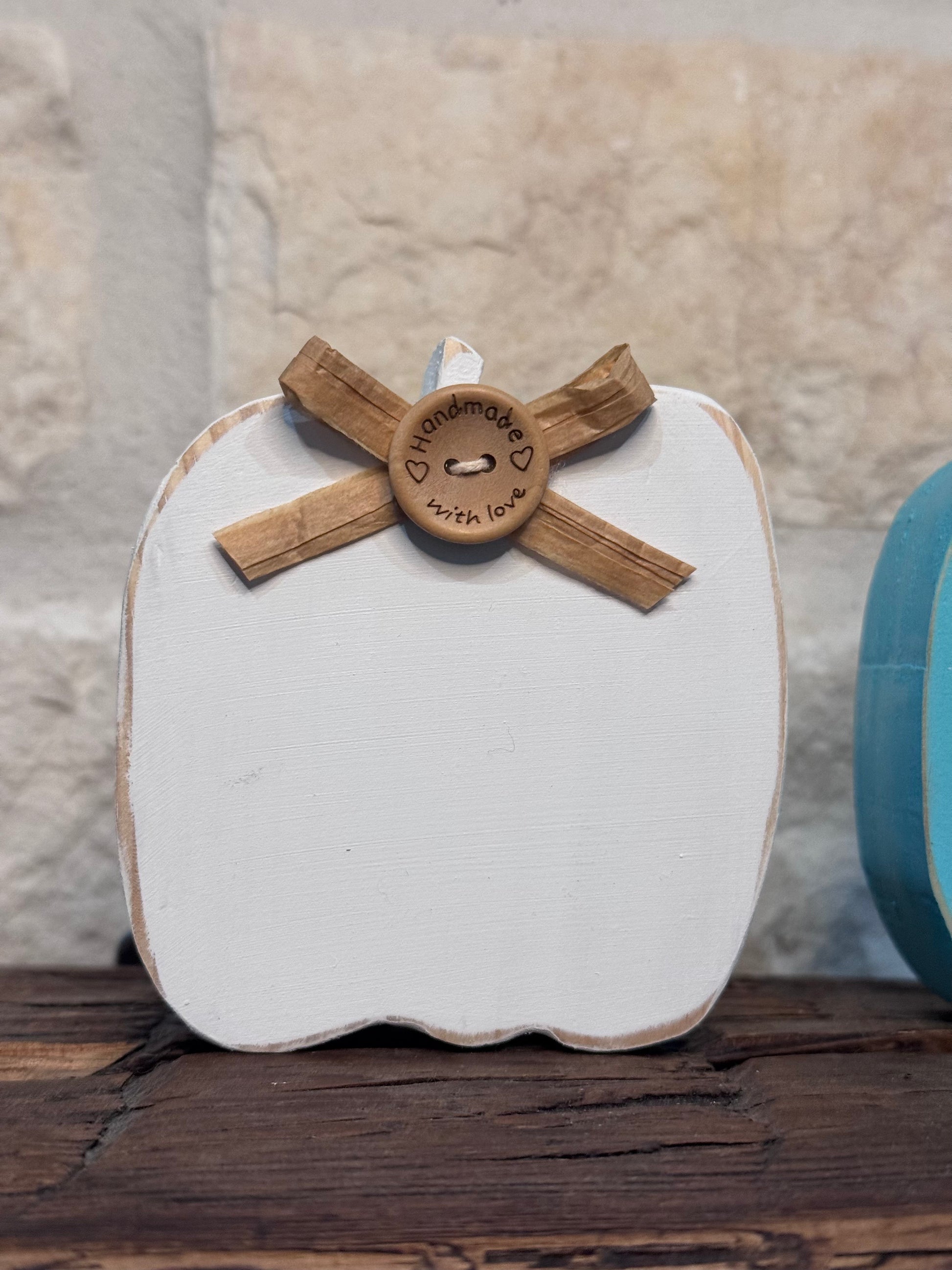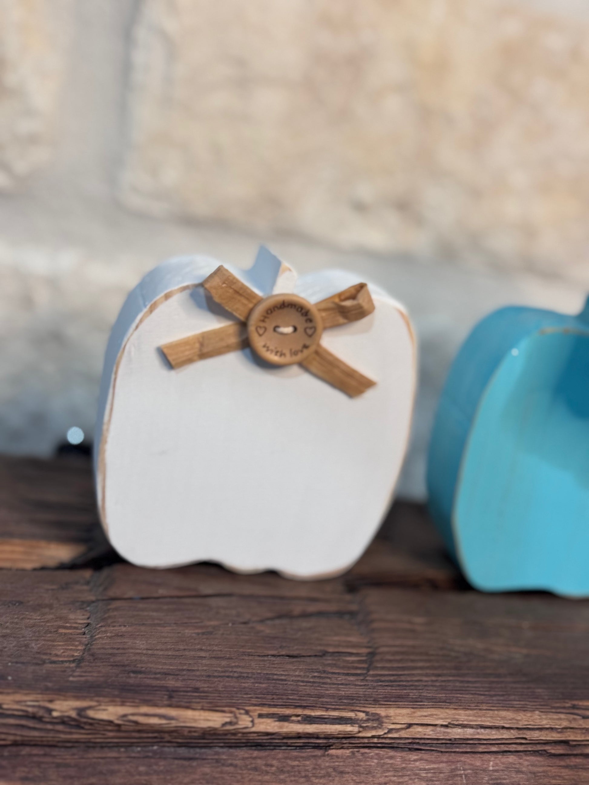 Bring a cozy and colorful touch to your fall décor with this charming wooden pumpkin trio. Each wood crafted, hand-painted pumpkin has its own unique personality—one dressed in crisp white with a rustic bow and button detail, another in a cheerful turquoise topped with a handcrafted book-page flower, and the last in a warm autumn orange tied with twine and a delicate leaf accent. Perfect for mantels, shelves, or entryway displays, this set blends farmhouse charm with a pop of seasonal style. A timeless piece you’ll love decorating with year after year!