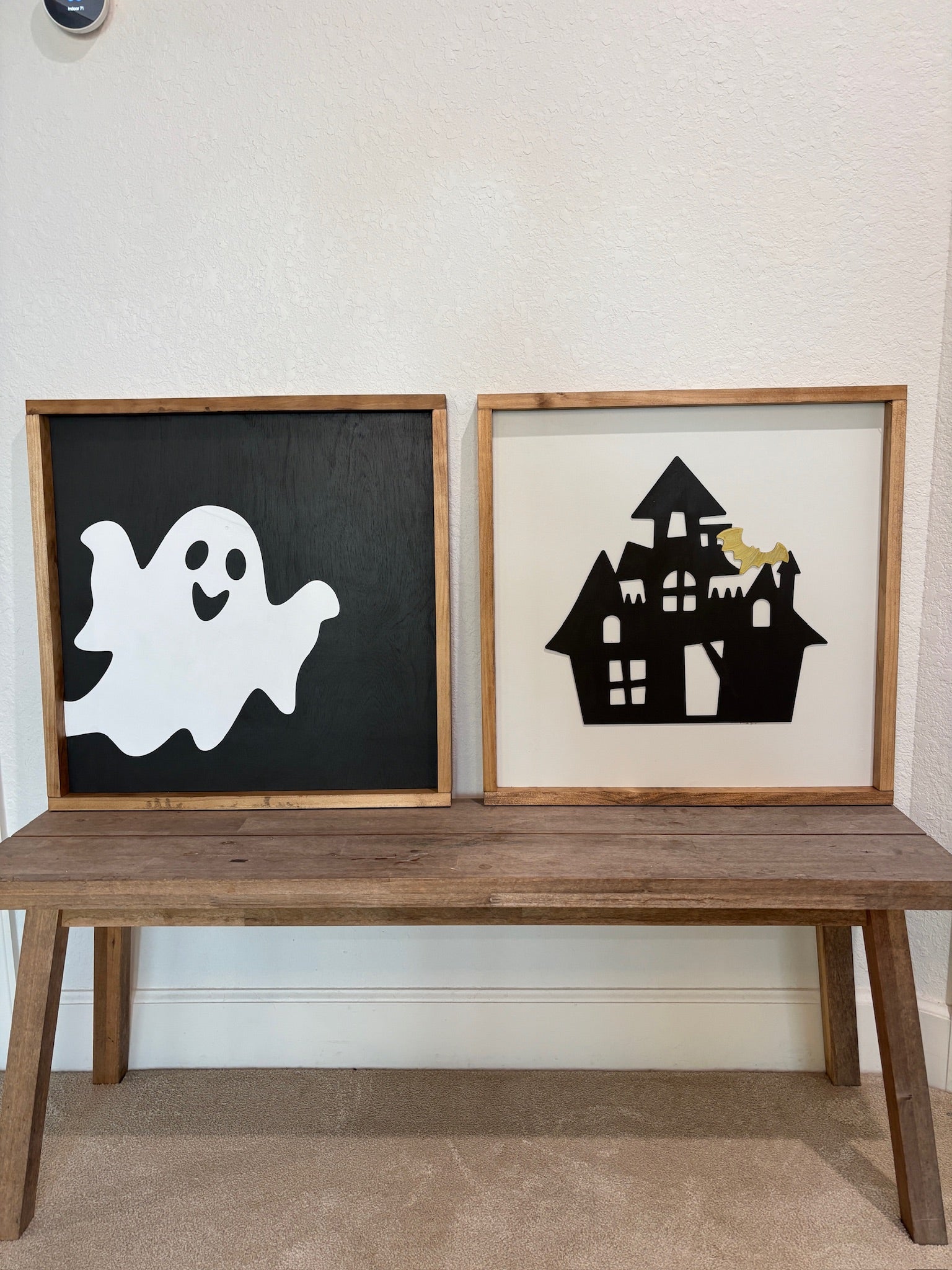 Ghost, Haunted Mansion and Jack-o-lantern are balsa wood laser cutouts. The Skeleton is made with HTV.